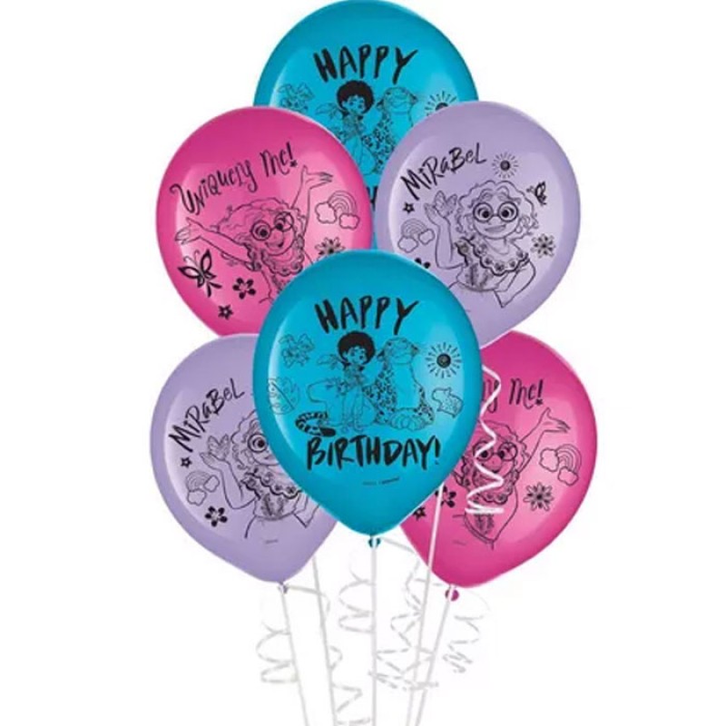 Let guests know where your Encanto party is with a balloon bouquet. The latex balloons are blue, pink, and purple and feature Mirabel, Antonio, and "Happy Birthday" messages.